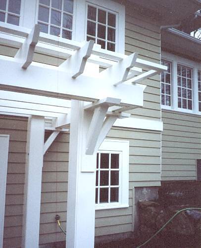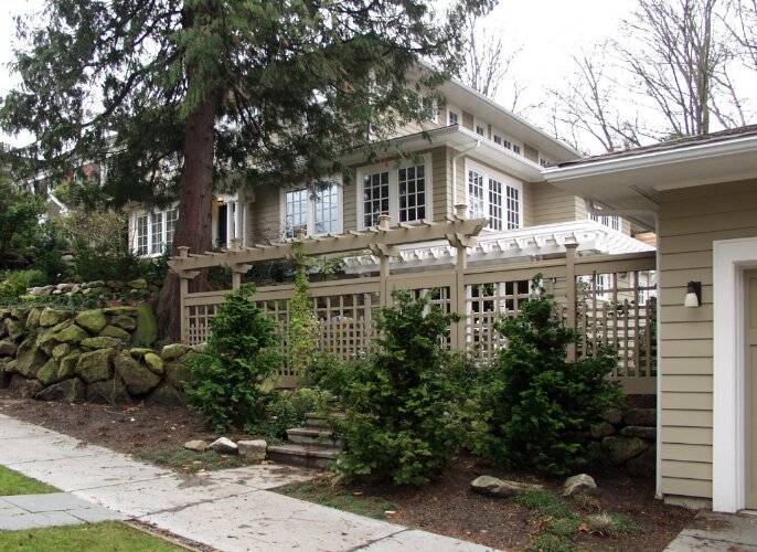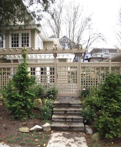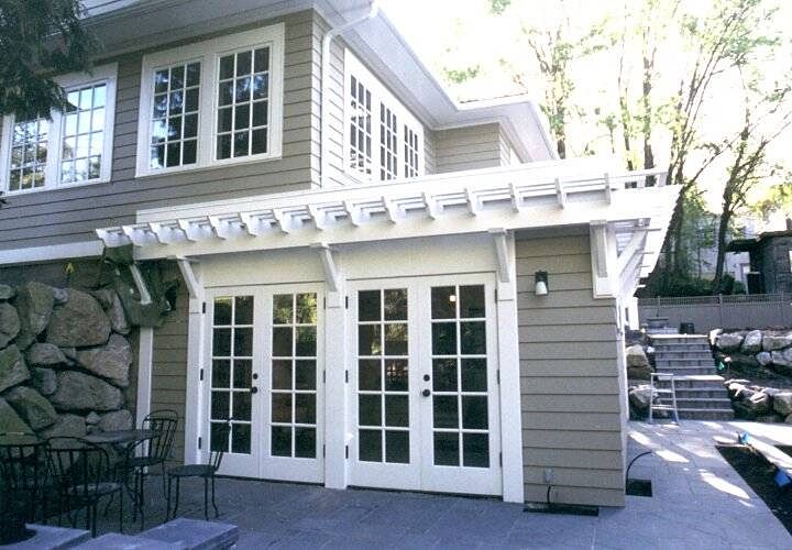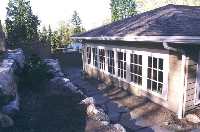 On the ground floor of the original dwelling, the kitchen, dining, and living rooms were extended, and the front porch was reconfigured to provide a new covered entry. At the rear of the house, a new stairway led from a patio outside the main living area down to a newly created lawn. This lawn had been raised from its original height to an intermediate level which would better relate to the house and allow the parents to watch their children while at play.