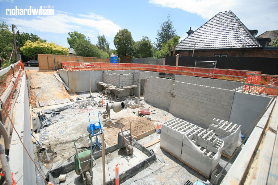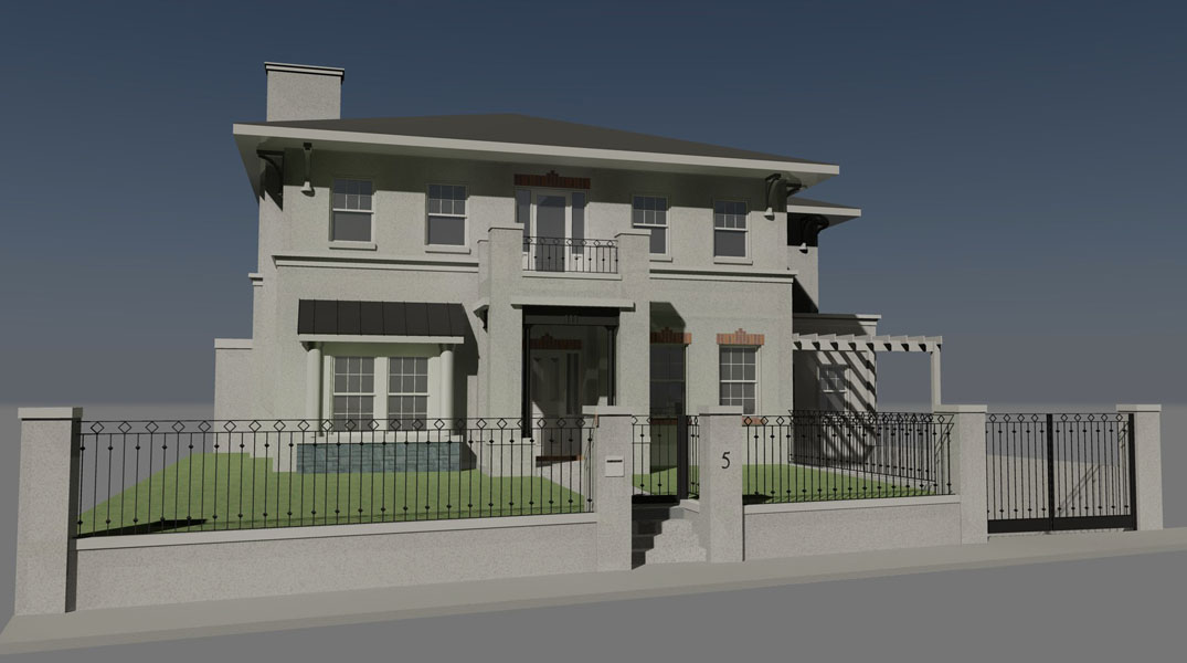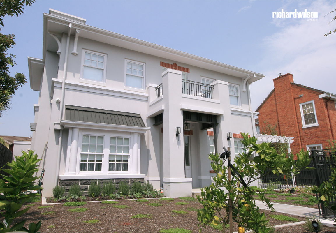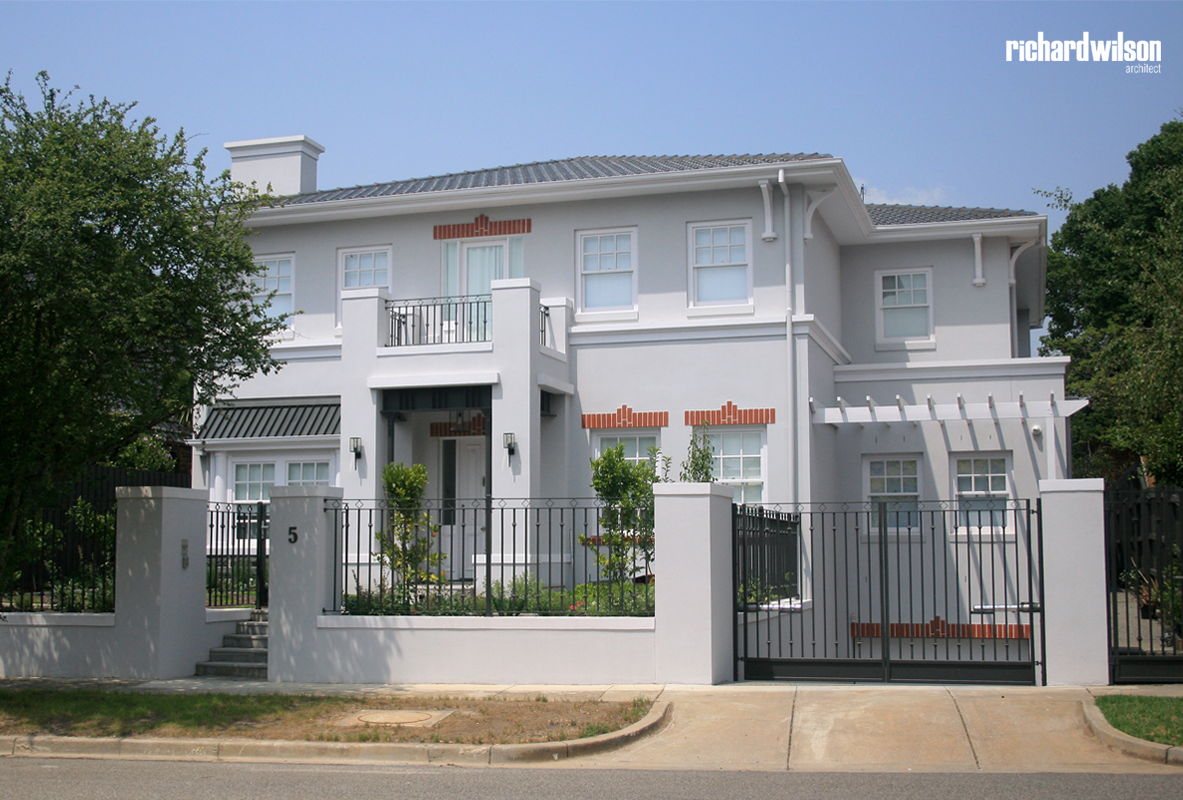 The street façade is predominantly based on the Neo-Georgian style of the house that was previously on the site. However, it is combined with elements borrowed from other more recent styles to update it and distinguish it from the older homes. The typical boxy form of this style also suits the need to use all of the available land to its fullest.