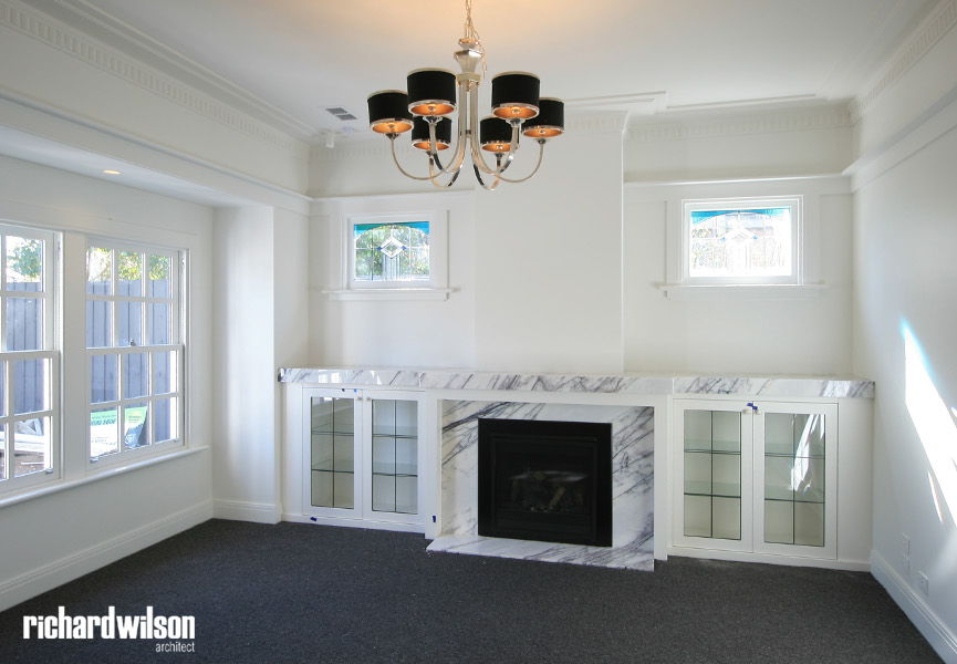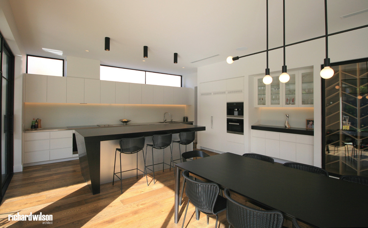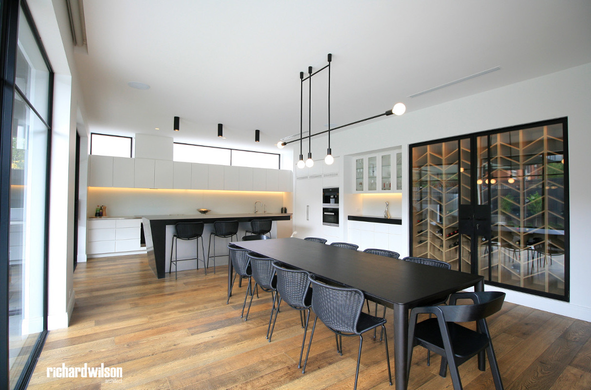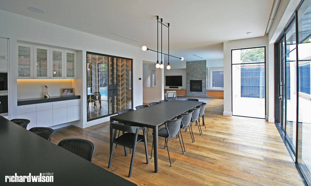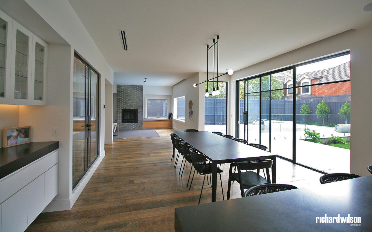 The interior and rear of the house is an eclectic mix of Art Deco and contemporary elements. This was partially derived from ornate Art Deco details that were in the original house. Two leadlight windows were salvaged for reuse in the sitting room, and several of the unique plaster ceiling panels were saved as well. New steel doors and windows were used in locations selected for maximum impact, both externally and internally. Other doors, trimwork, cornices, and even door hardware were selected that suit the style. However, little of it is overtly Art Deco so that it can subtly blend with the contemporary feel of the spaces.