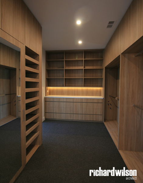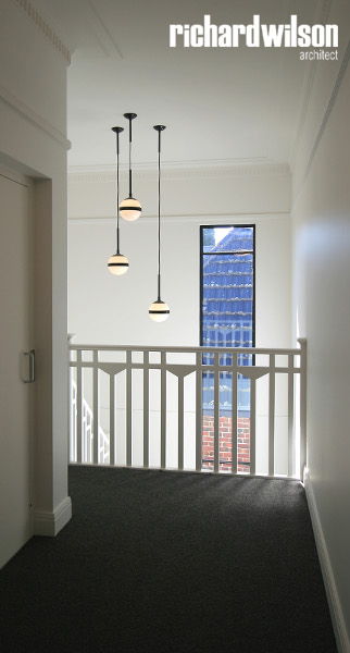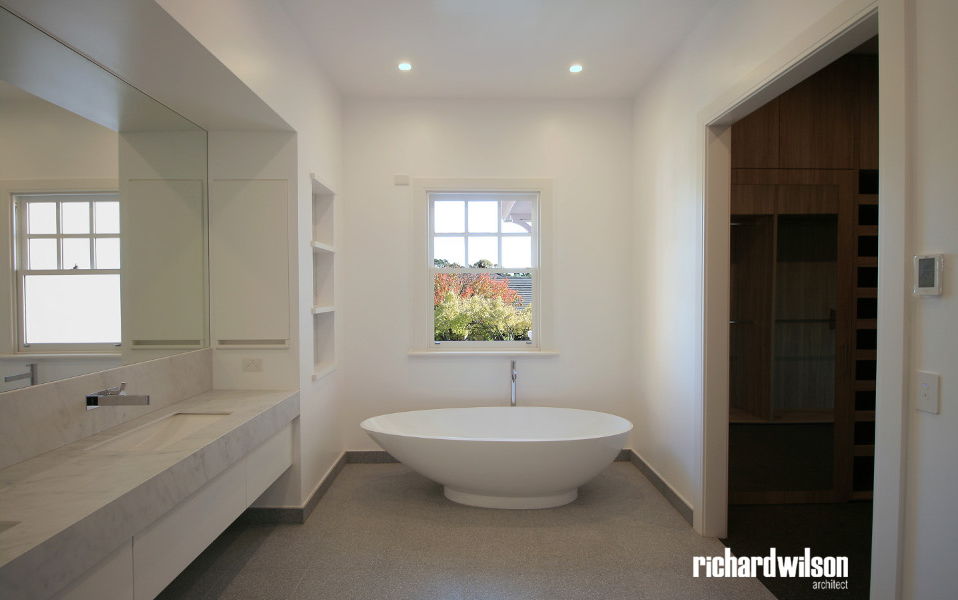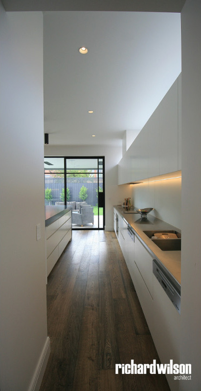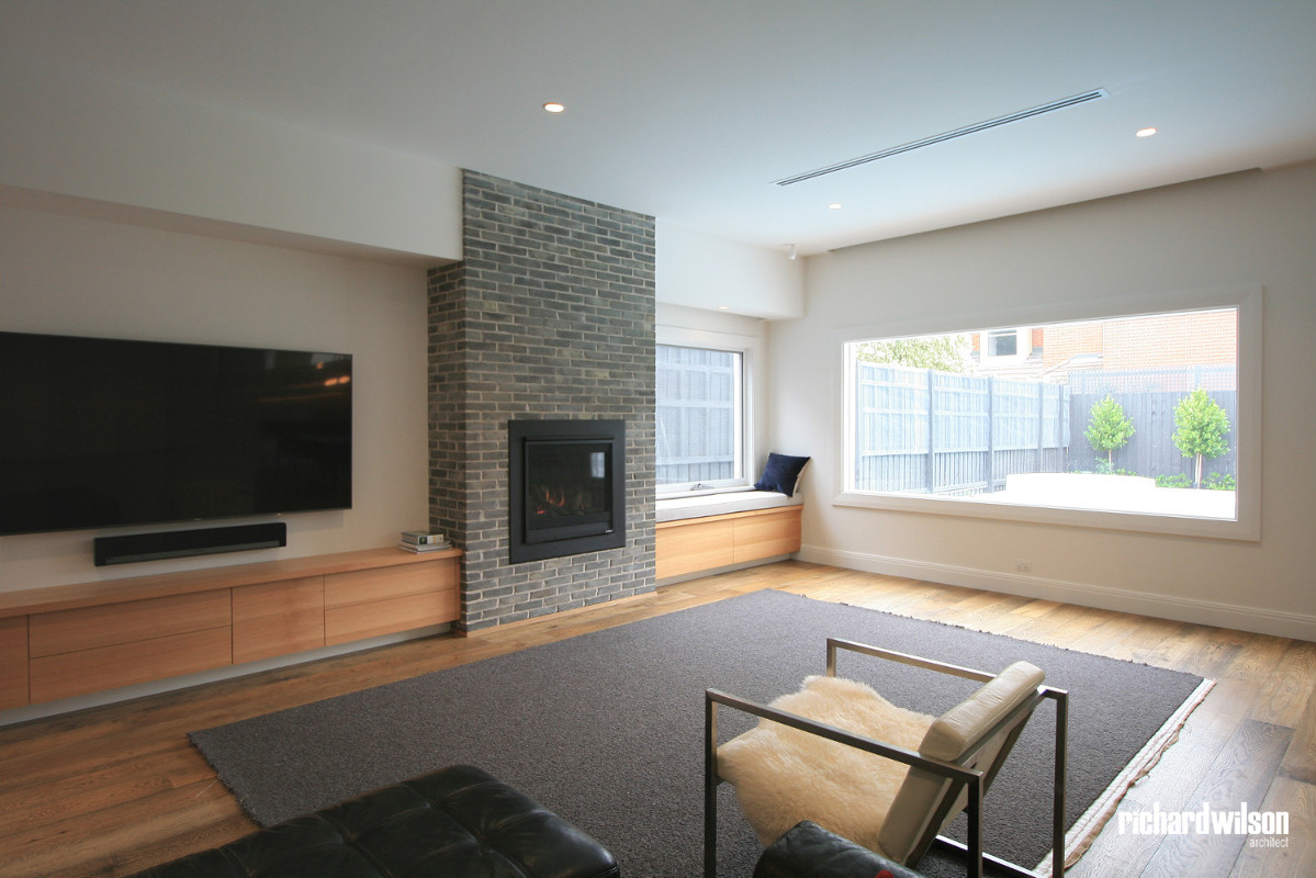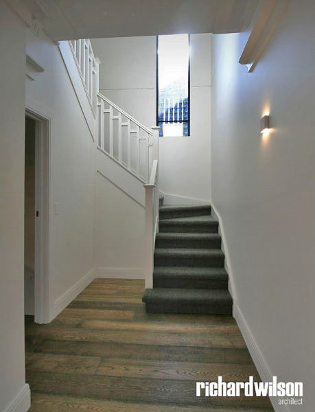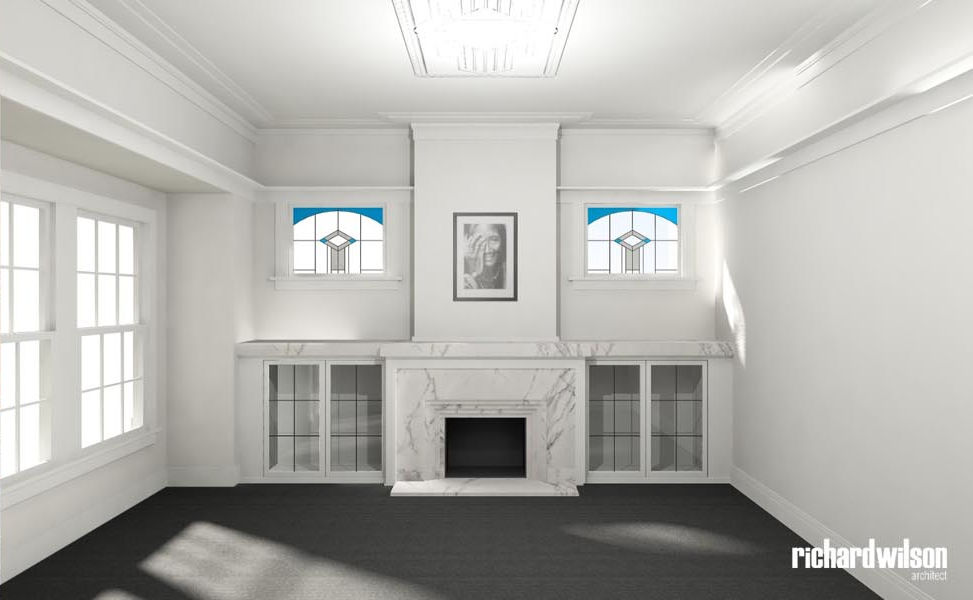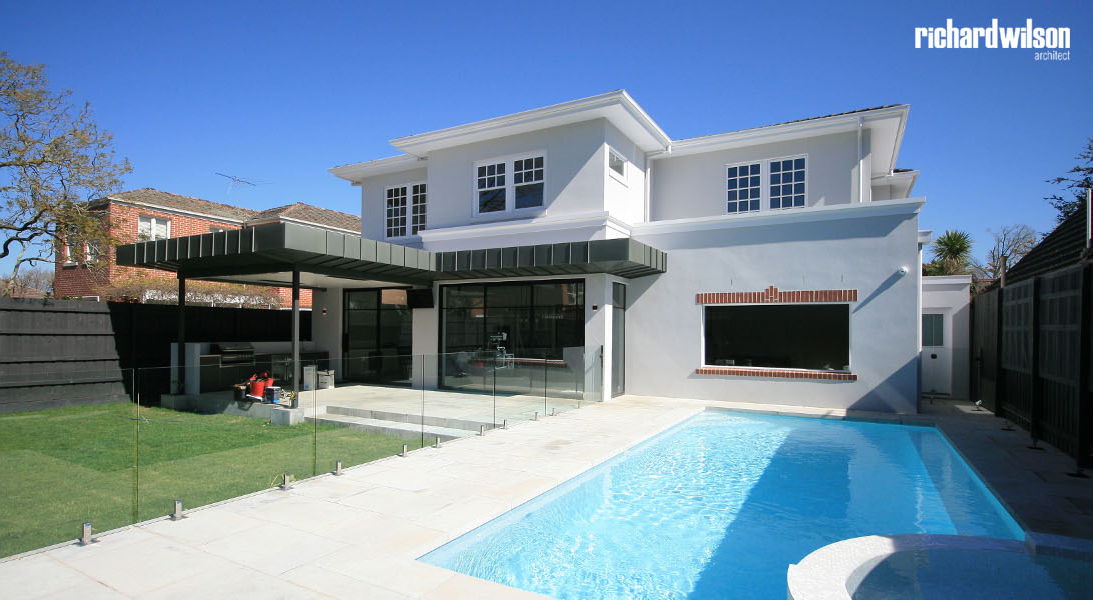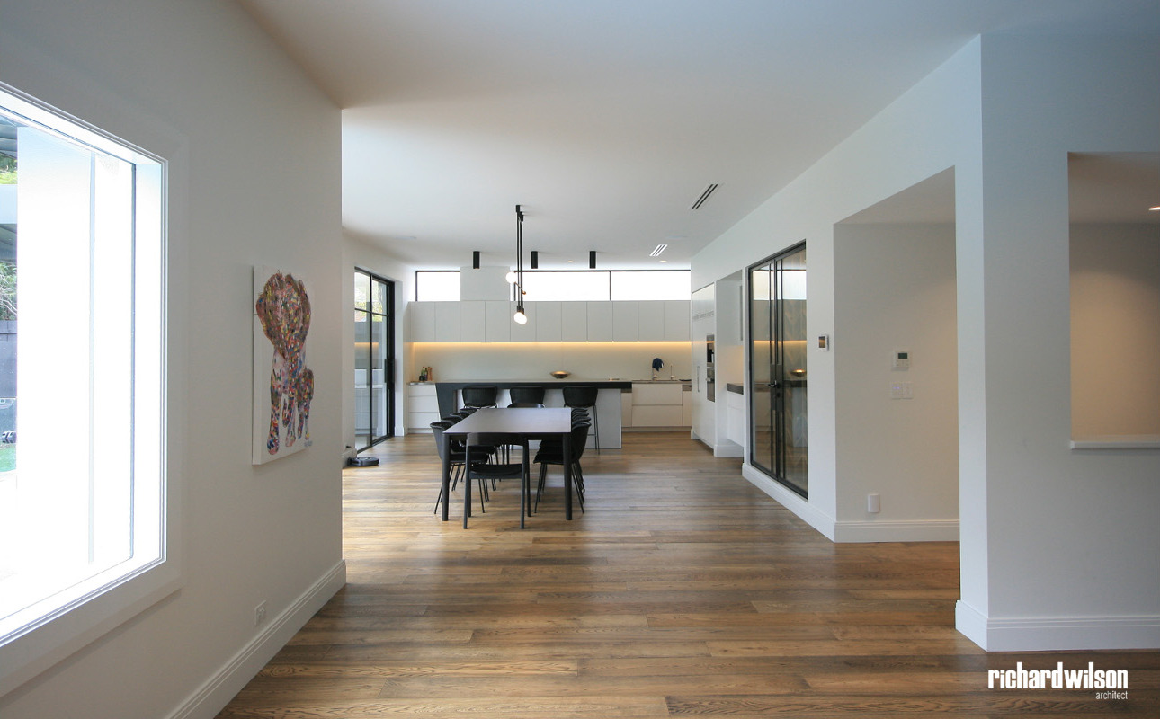 The interior and rear of the house is an eclectic mix of Art Deco and contemporary elements. This was partially derived from ornate Art Deco details that were in the original house. Two leadlight windows were salvaged for reuse in the sitting room, and several of the unique plaster ceiling panels were saved as well. New steel doors and windows were used in locations selected for maximum impact, both externally and internally. Other doors, trimwork, cornices, and even door hardware were selected that suit the style. However, little of it is overtly Art Deco so that it can subtly blend with the contemporary feel of the spaces.
